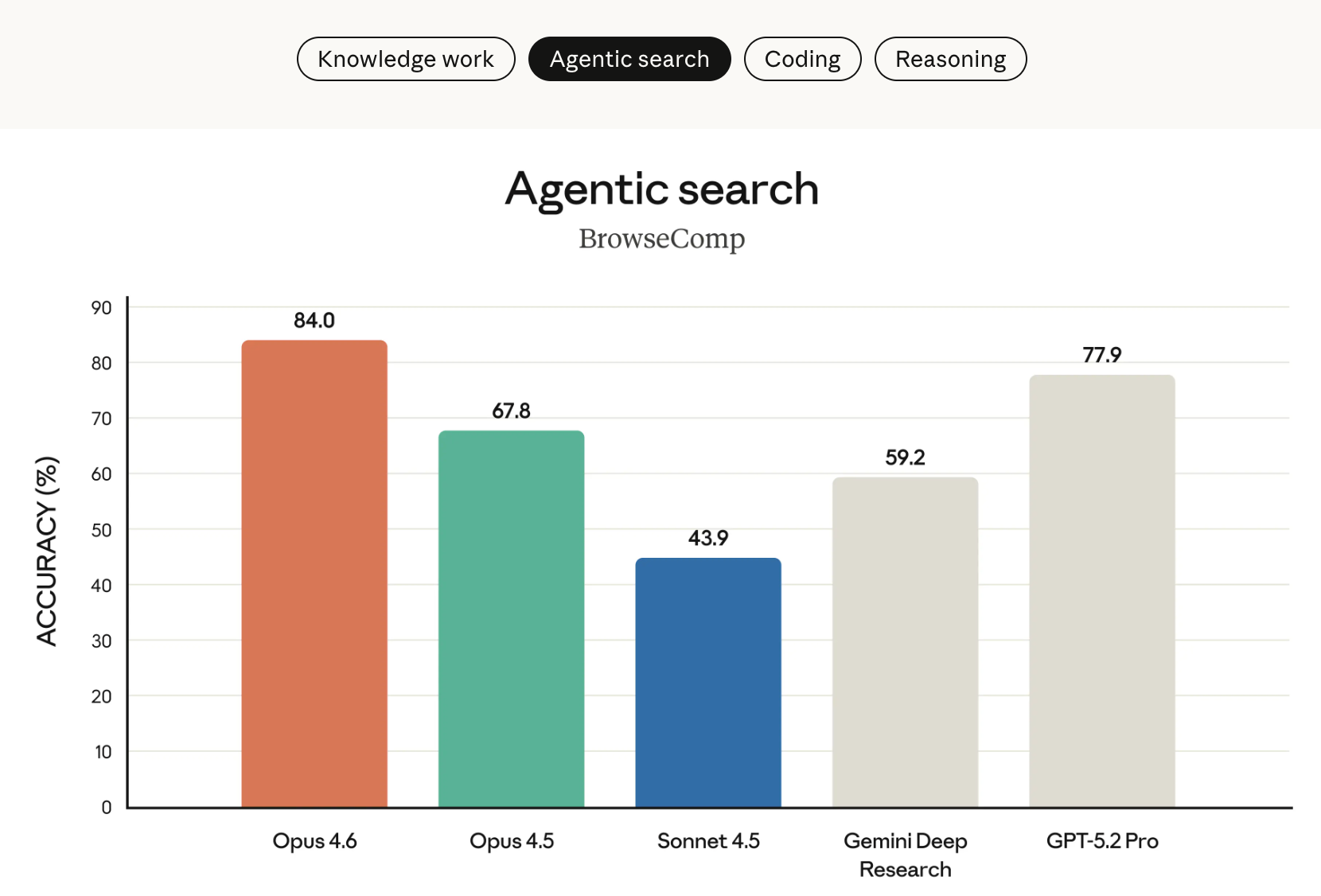 在 BrowseComp(评估模型在线查找难以定位信息能力的测试)上,Opus 4.6 的表现同样优于所有其他模型。