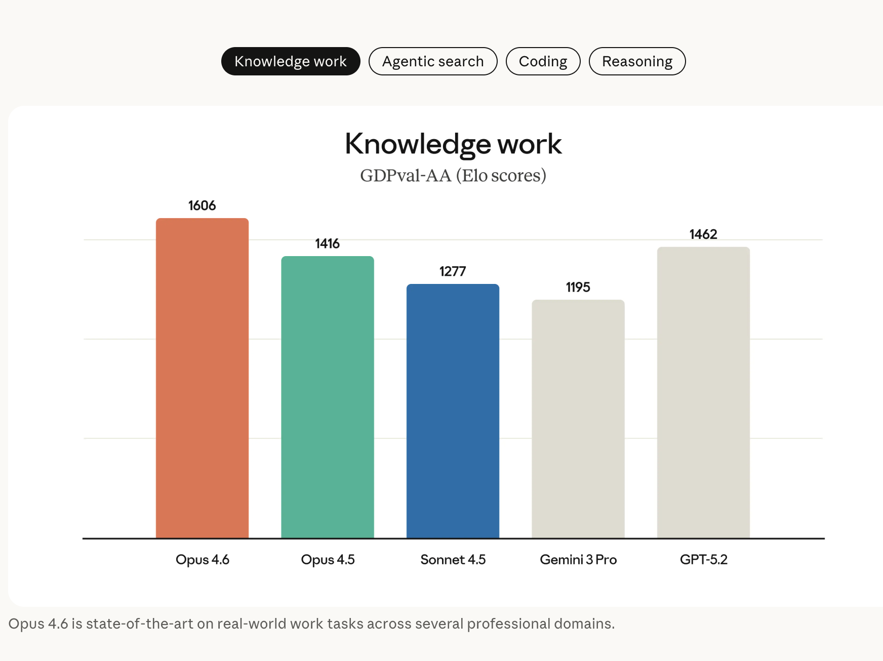 在知识更新方面,Claude Opus 4.6 的知识截止日期为 2025 年 5 月。在金融、法律等领域经济价值型任务评测集 GDPval-AA 上,Opus 4.6 的表现比业界第二名模型(OpenAI GPT-5.2)高约 144 Elo,比自家前代模型 Opus 4.5 高 190 Elo。
