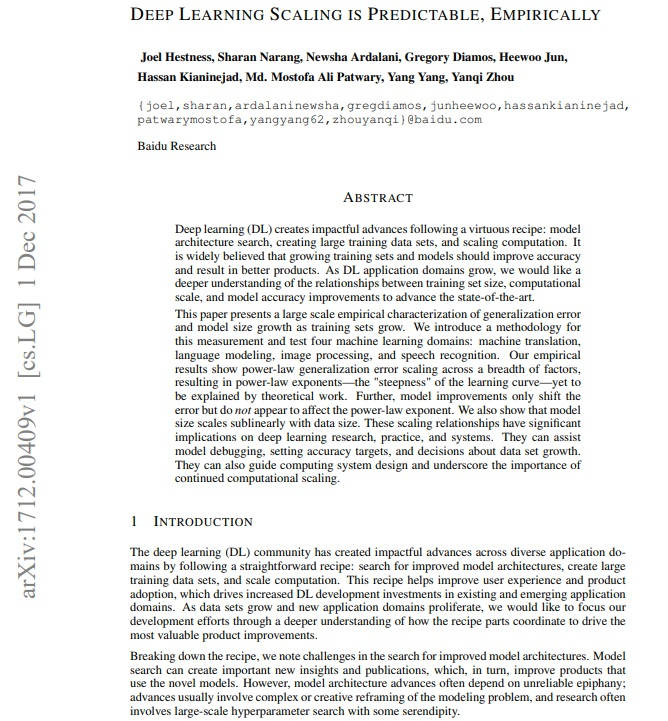 值得一提的是,在百度期间,他的团队还进行了关于深度学习缩放定律(Scaling Laws)的探索并发表了论文,后来成为推动大模型发展的重要理论基石