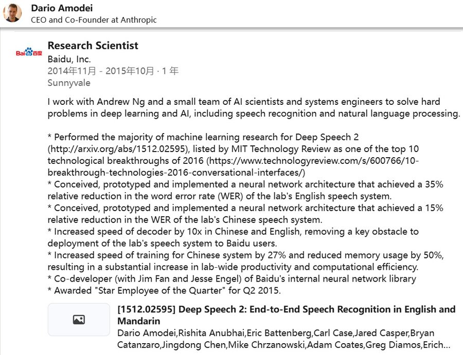然而Dario Amodei的职业起点之一,正是中国公司百度的硅谷AI实验室。