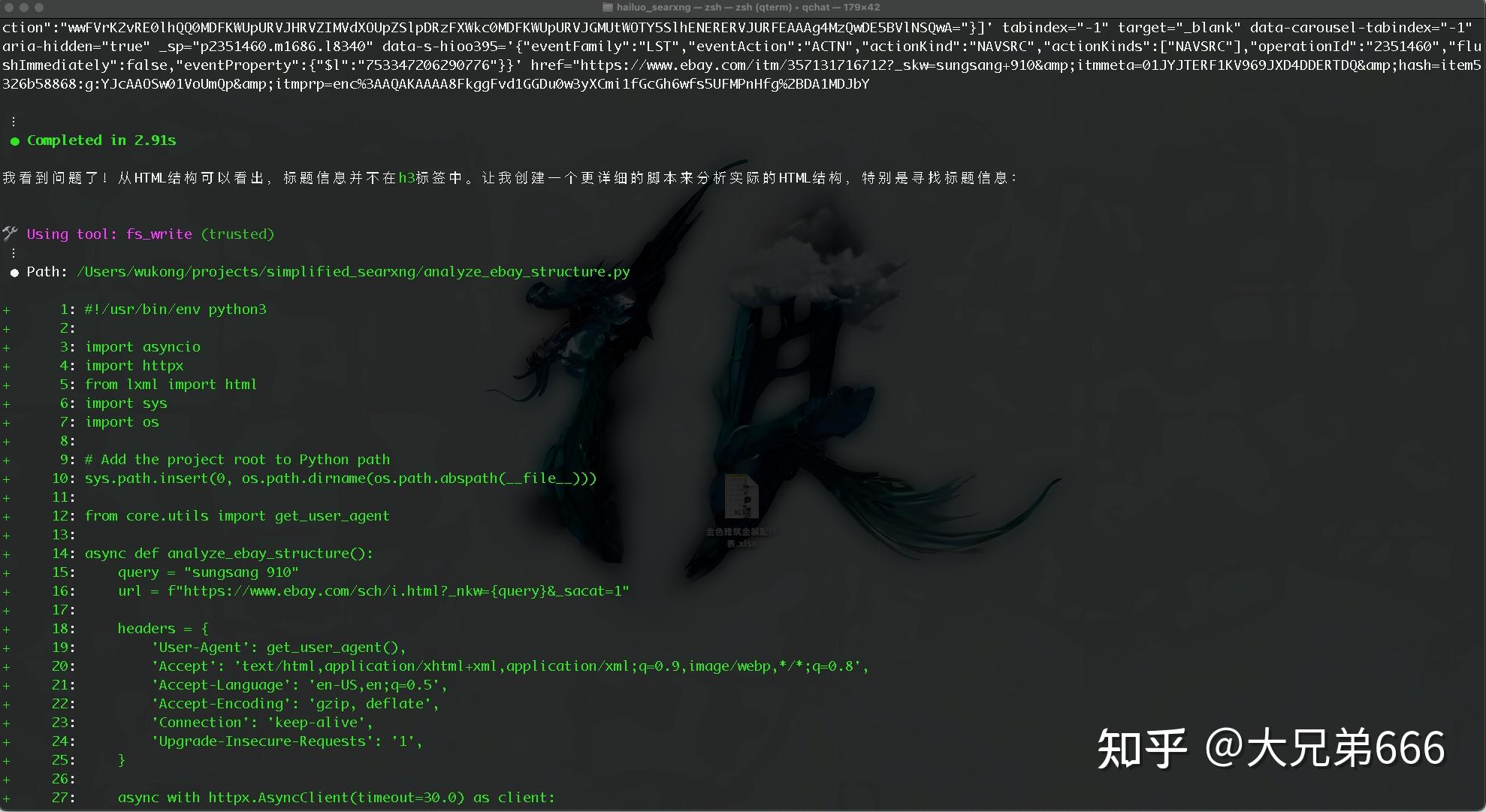 另外测试中发现 Manus 的 ebay 脚本有些问题(程序没 bug,但是存在解析偏差),amazon q 自己做了 debug,甚至写了一个脚本,拿到了 ebay 返回的原始 HTML 自己分析了一遍,然后改写了提取方案,效果居然出奇的好……
