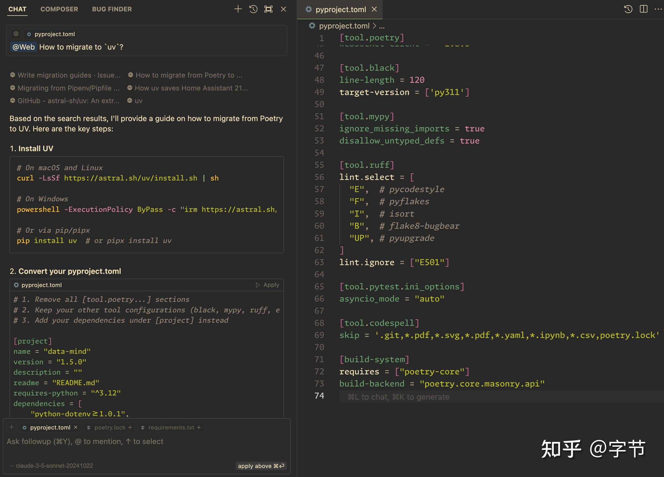 平时在 debug 一些问题和学习一些新框架时,我们也会经常使用 devv,phind 这类代码领域的 perplexity。我们同样也可以用@Web指令来让 Cursor 去做一些网络搜索,获取更加全面和 up to date 的知识信息,然后结合我们的代码库给出更具有针对性的解决方案。比如我们可以尝试下让 Cursor 来帮我们从poetry迁移到uv: