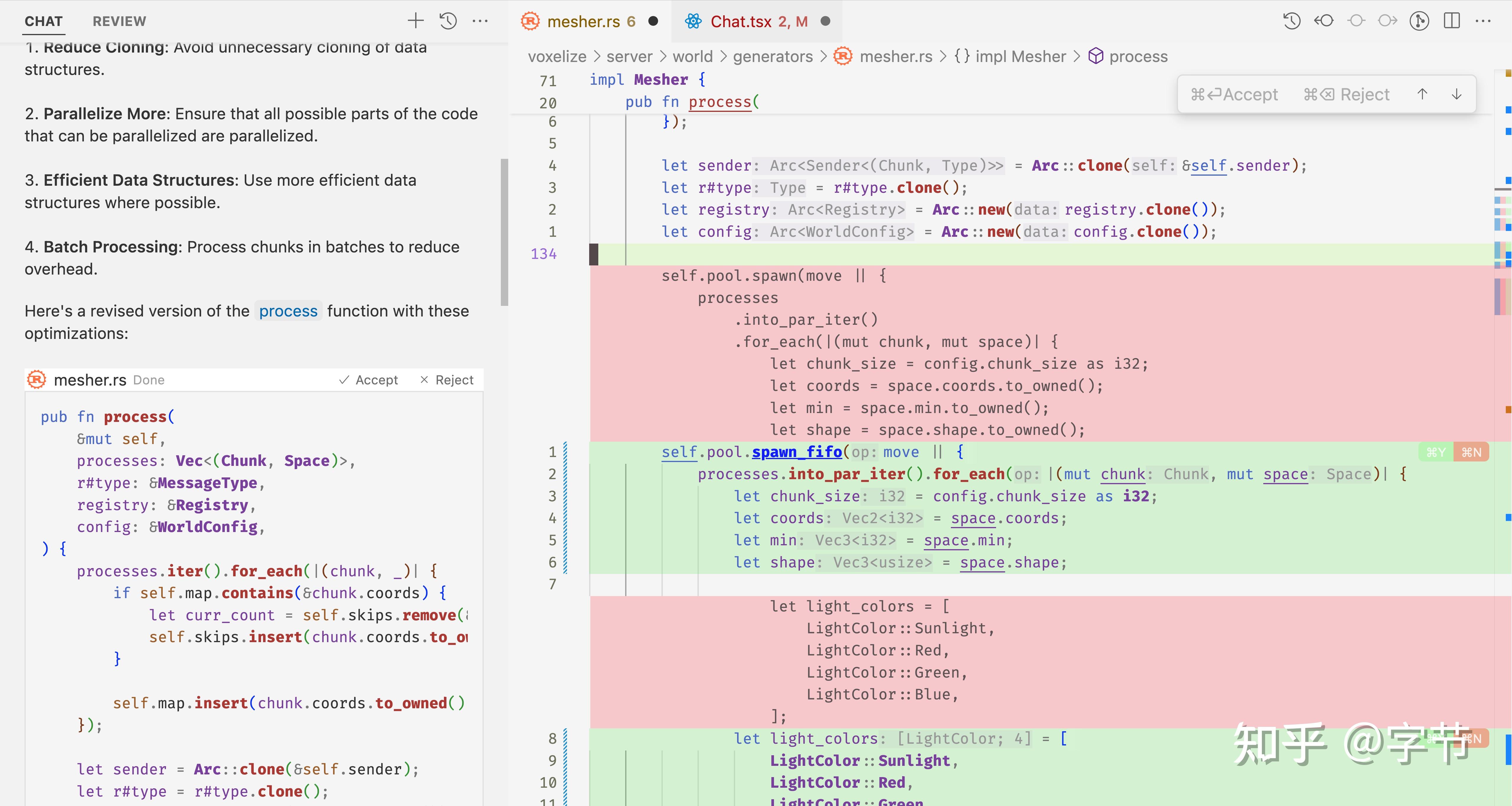 这是来自官网的一个案例,看起来应该是在做一些 Rust 代码的优化工作。我们日常也可以通过 Chat 让 Cursor 来帮忙快速 review 整个文件,并对例如性能、稳定性、安全等方面提出检查与优化需求。