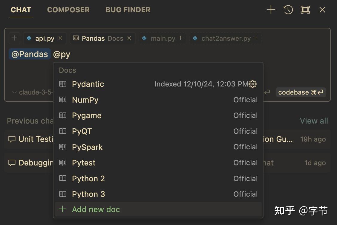 此外还有个类似的功能是@Docs,尤其适合一些非常流行的 library 有不兼容的大版本变更情况。比如 Pydantic 1.x 版本存在了很久,模型训练中可能已经对其形成了比较牢固的记忆了。但是项目中实际使用的是 Pydantic 2.x 版本,这时候将新版文档的网址引入进来,提供给模型参考就会非常有必要,能大大提升生成代码的准确性。