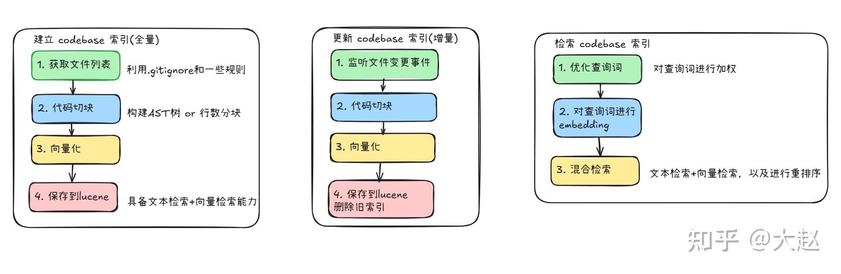 每一个代码块单独调用embedding接口向量化,然后把向量化结果保存到 lucene 索引中,lucene 索引中包含了代码块的文本内容、向量化结果、文件路径、行号等信息