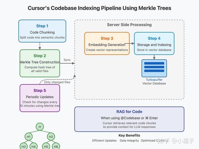 Merkle 树结构允许 Cursor 高效地验证正在索引的文件是否与服务器上存储的内容匹配。分层哈希结构使得在传输过程中很容易检测到任何不一致或损坏的数据。