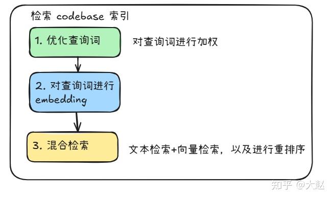- 检索codebase索引:根据查询进行向量化检索+文本检索,这里采用了混合检索来提高准确率,并且通过提示词加权来提高检索词的权重