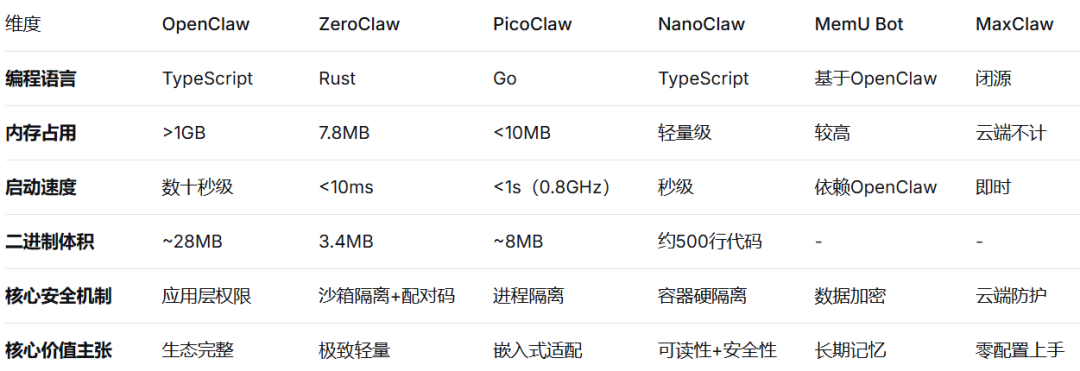 我体验了一些主流的变种版本,主要有:ZeroClaw、PicoClaw、NanoClaw、MemUBot、MaxClaw……同时也进行了深度对比分析,希望给大家带来一些参考和帮助~