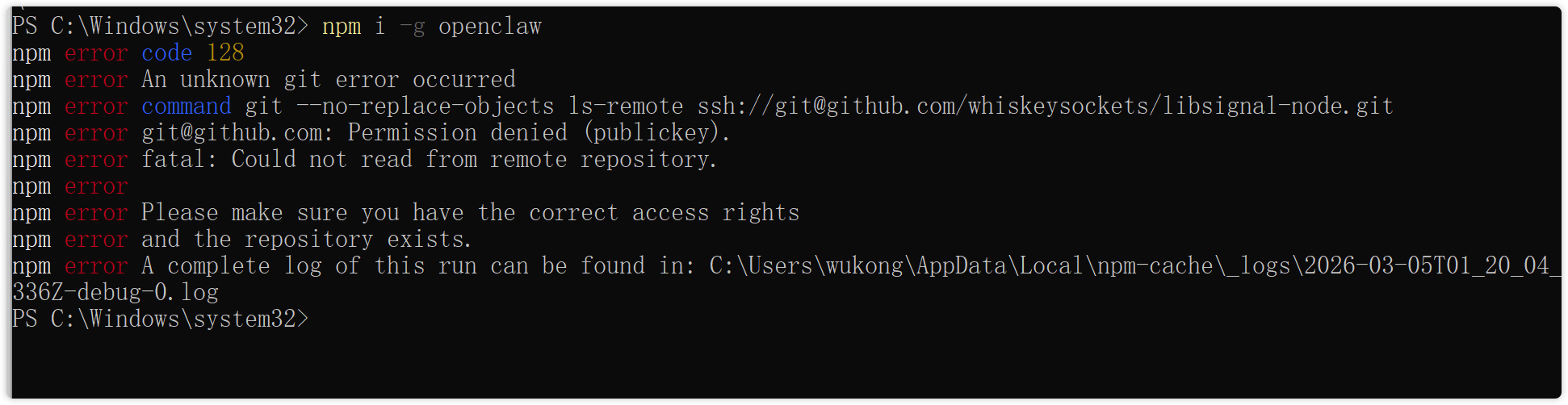 这个 npm 错误(code 128)核心原因是:你的本地环境没有配置有效的 GitHub SSH 公钥,导致 npm 尝试通过 SSH 协议拉取 libsignal-node 仓库时被拒绝权限访问。