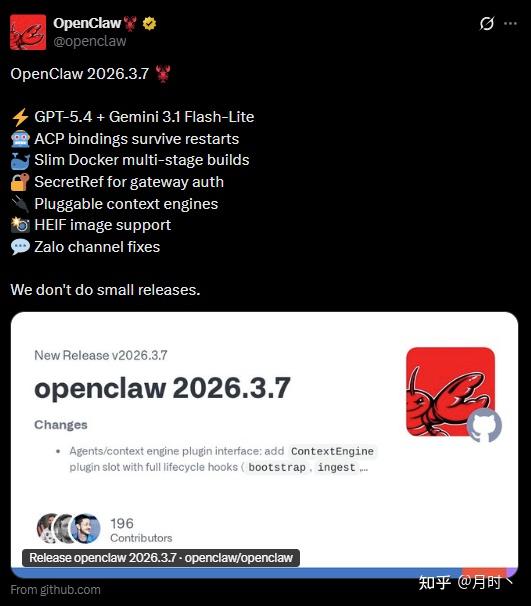 就在昨天,热门智能体项目 OpenClaw 现已更新至 2026.3.7 版本,带来了上下文引擎插件、lossless-claw 等重磅功能,并进一步扩展了对一系列新模型的支持。