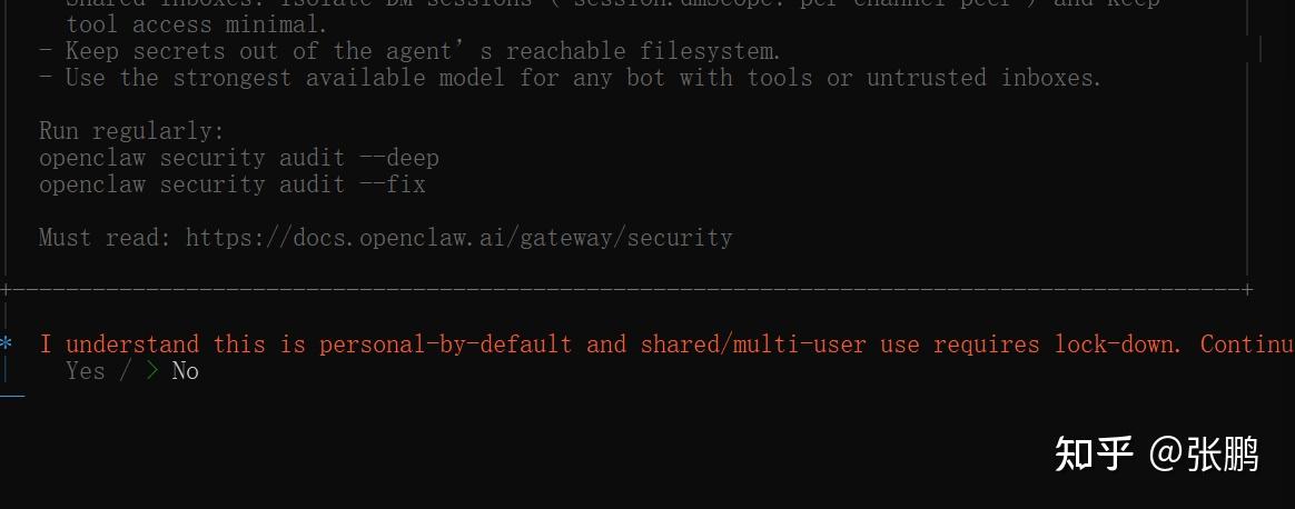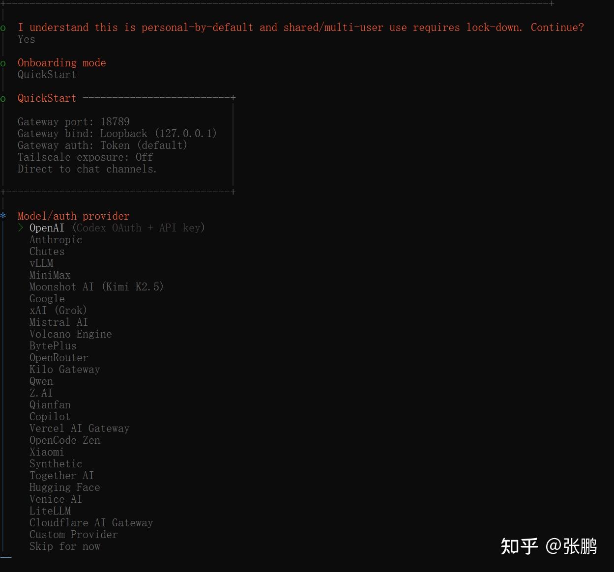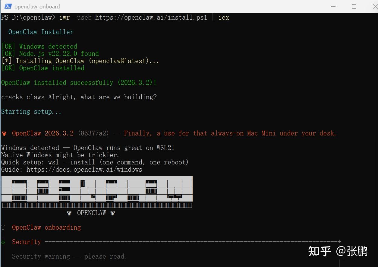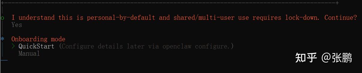 - 安装成功,自动进入首次配置界面(即OpenClaw onboarding)。