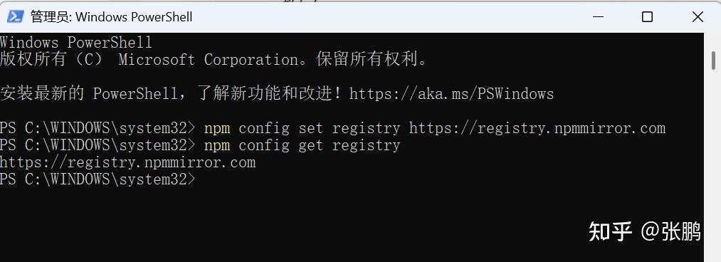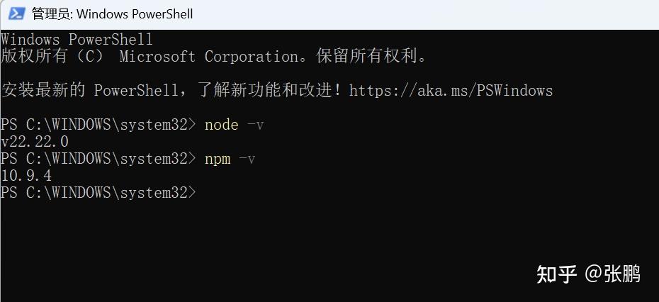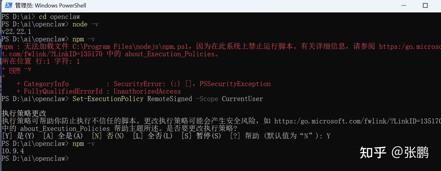 如果碰到错误 “npm : 无法加载文件 C:\Program Files\nodejs\npm.ps1,因为在此系统上禁止运行脚本。”就先输入 Set-ExecutionPolicy RemoteSigned -Scope CurrentUser