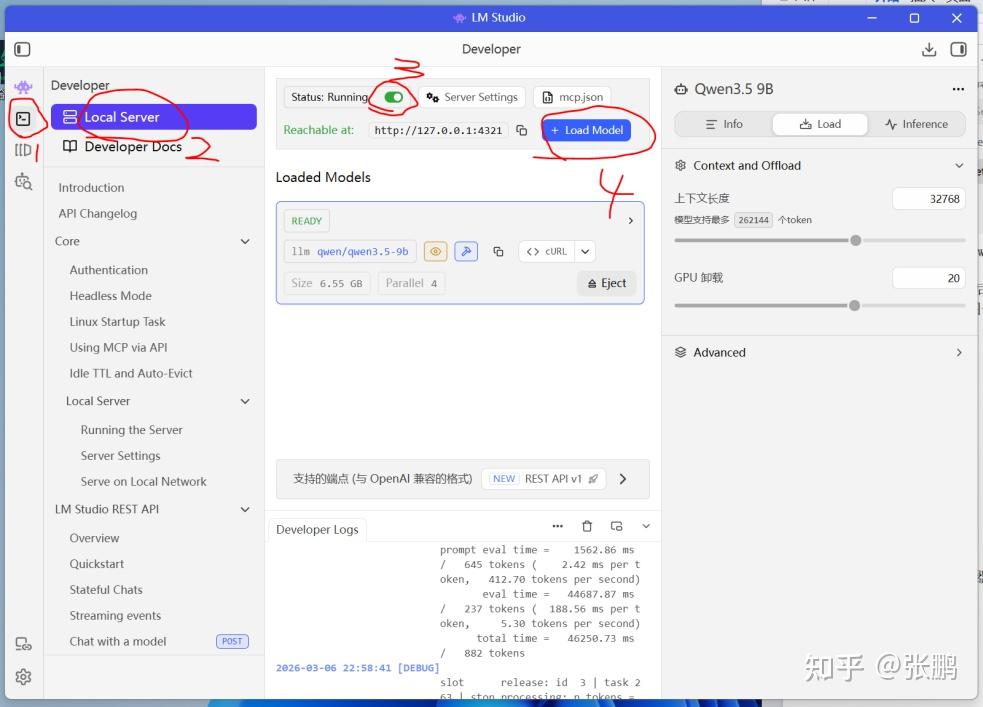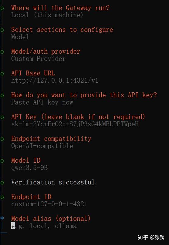 选择Local (this machine)→Model→Custom Provider→API Base URL(按照你们自己的地址和端口,一般不变,但是我改了端口为4321,所以是http://127.0.0.1:4321/v1)→API Key(输入刚才在LM Studio中的API Key;没设的话就空着)→Endpoint compatibility(选择OpenAI-compatible)→Model ID(qwen3.5-9B,我们使用的本地模型名称)→Verification(验证服务器是否OK)→Endpoint ID(随你,不改也行)→Model alias(别名,写不写都行)