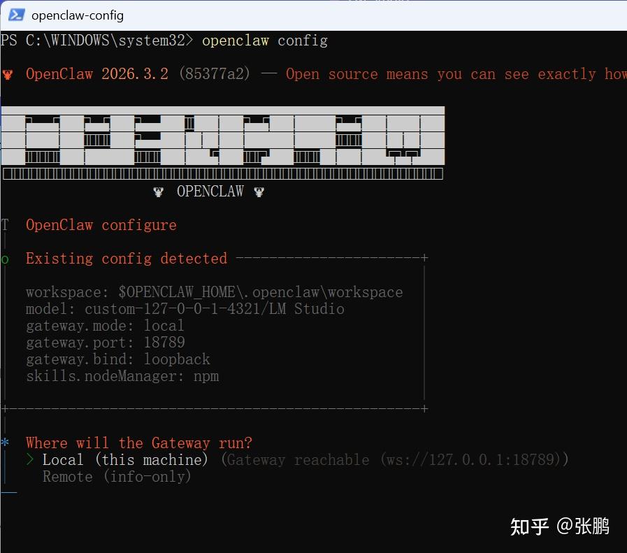 打开管理员模式的PowerShell终端,输入openclaw config,开始设置
