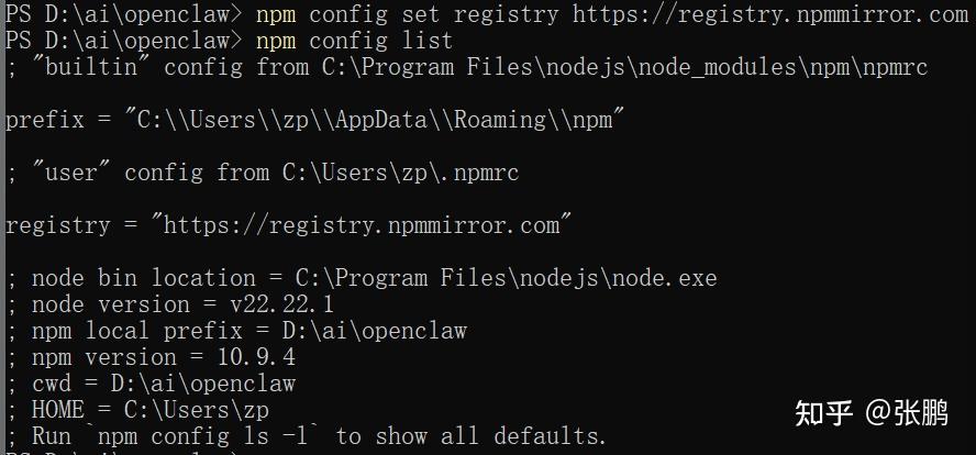 或npm config list #显示registry = “https://registry.npmmirror.com”