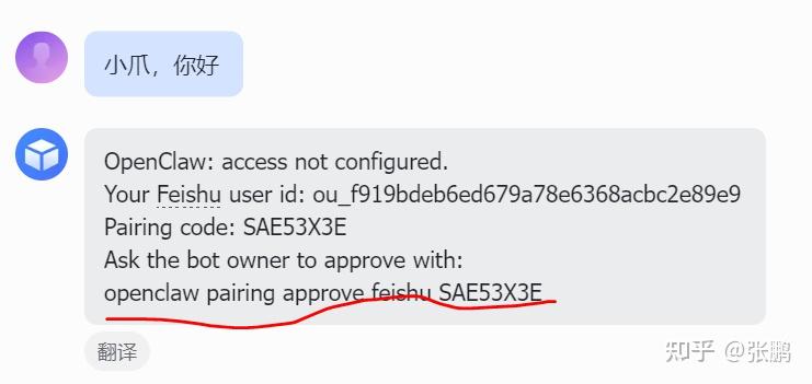 启动飞书客户端,添加机器人后发送一个消息,会返回配对码