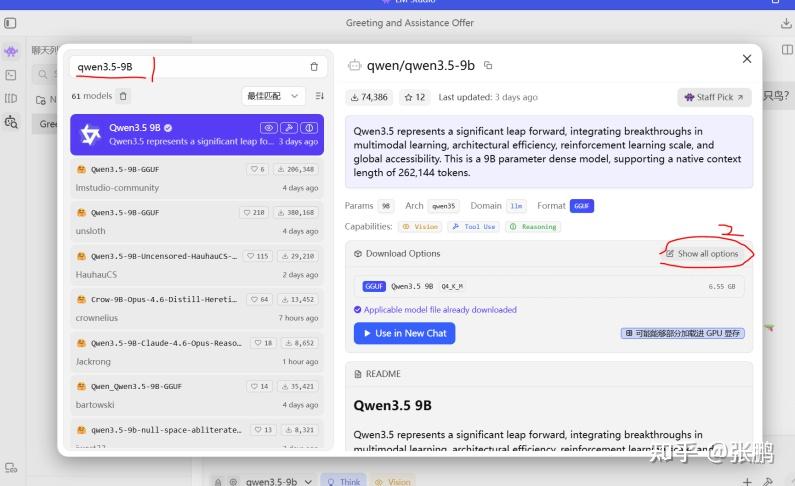 在1处搜索qwen3.5-9B,在2处可以选择具体版本。
