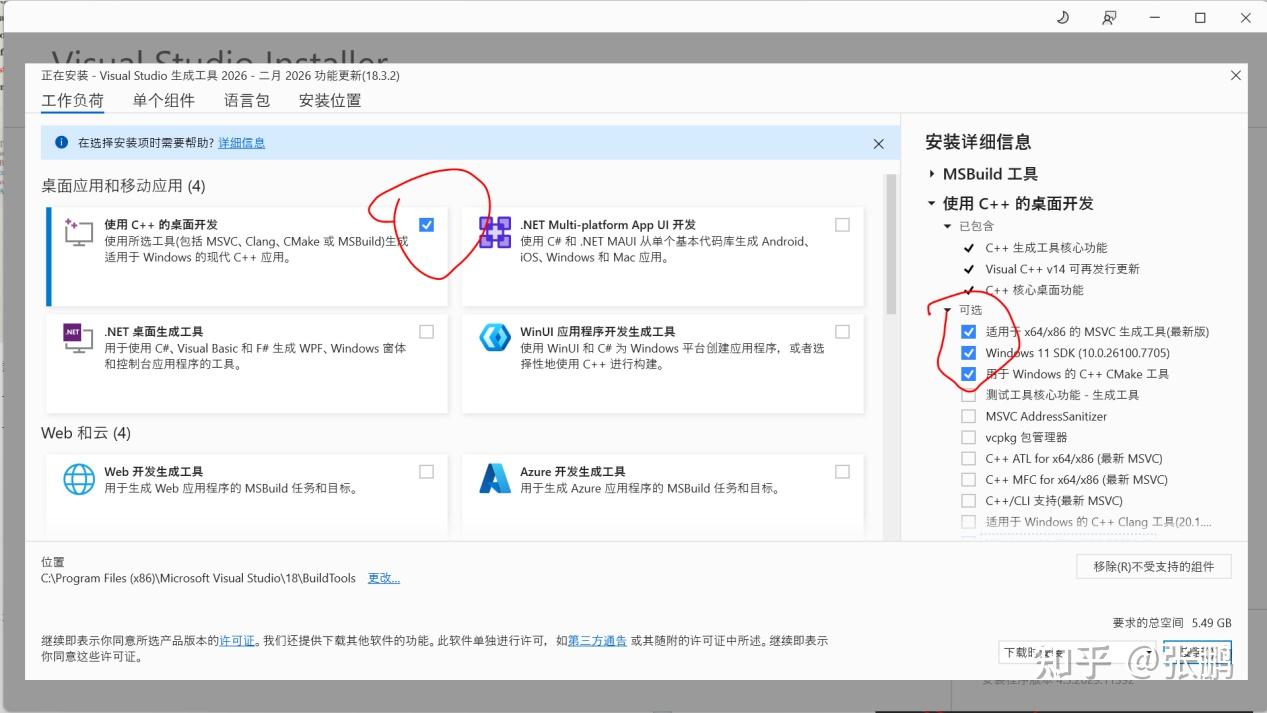 页面下载,安装时选择 “Desktop development with C++” 工作负载,确保安装 Windows 10⁄11 SDK。