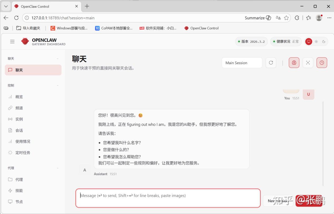 打开浏览器,输入地址,可以看到控制台了。(如果不行的话,关闭终端,重新打开一个,输入openclaw gateway start,启动网关;第一次访问控制台,一定要带上token= )