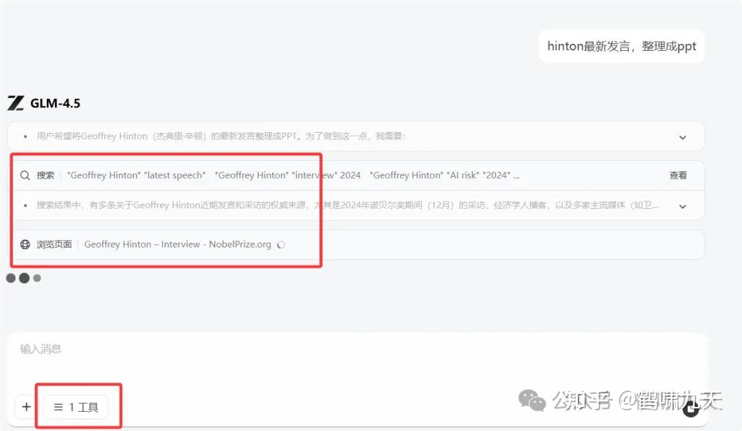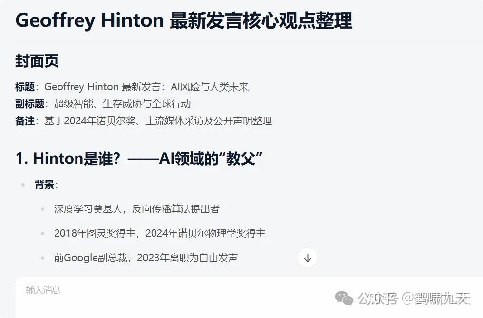 实测:开启全网搜索模式“hinton最新发言,整理成ppt”