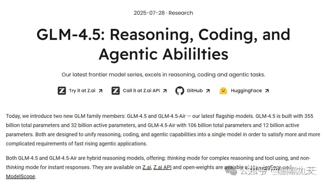 7月28日晚21点,智谱官方公众号发布新一代旗舰模型 GLM-4.5,专为智能体应用打造,同时融合了推理、代码和智能体能力。