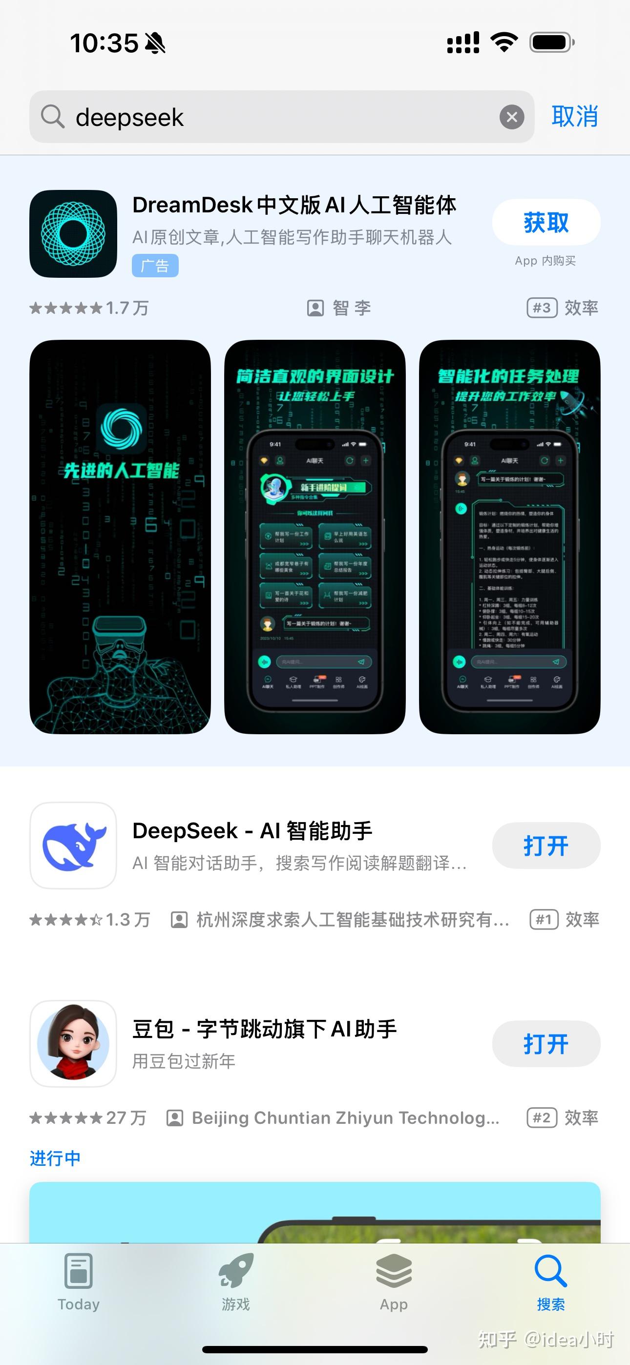 搜索DeepSeek,点击安装。认准杭州深度求索公司开发的APP,其他的都是伪造。。