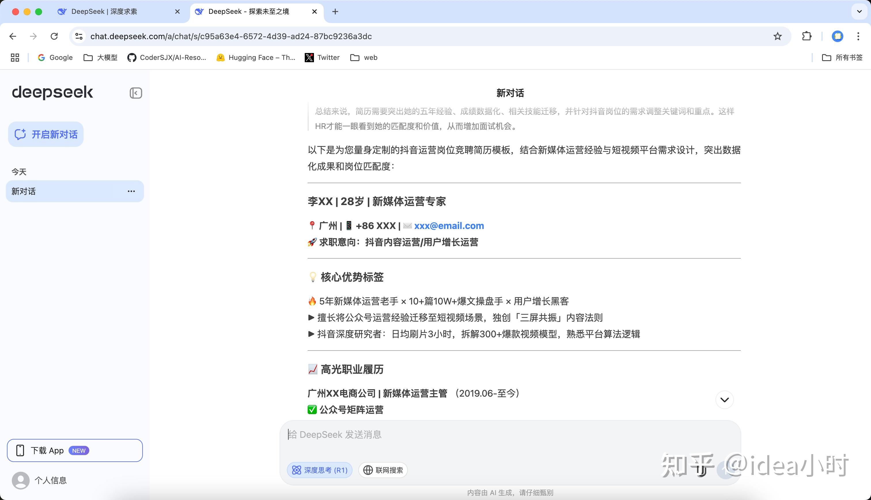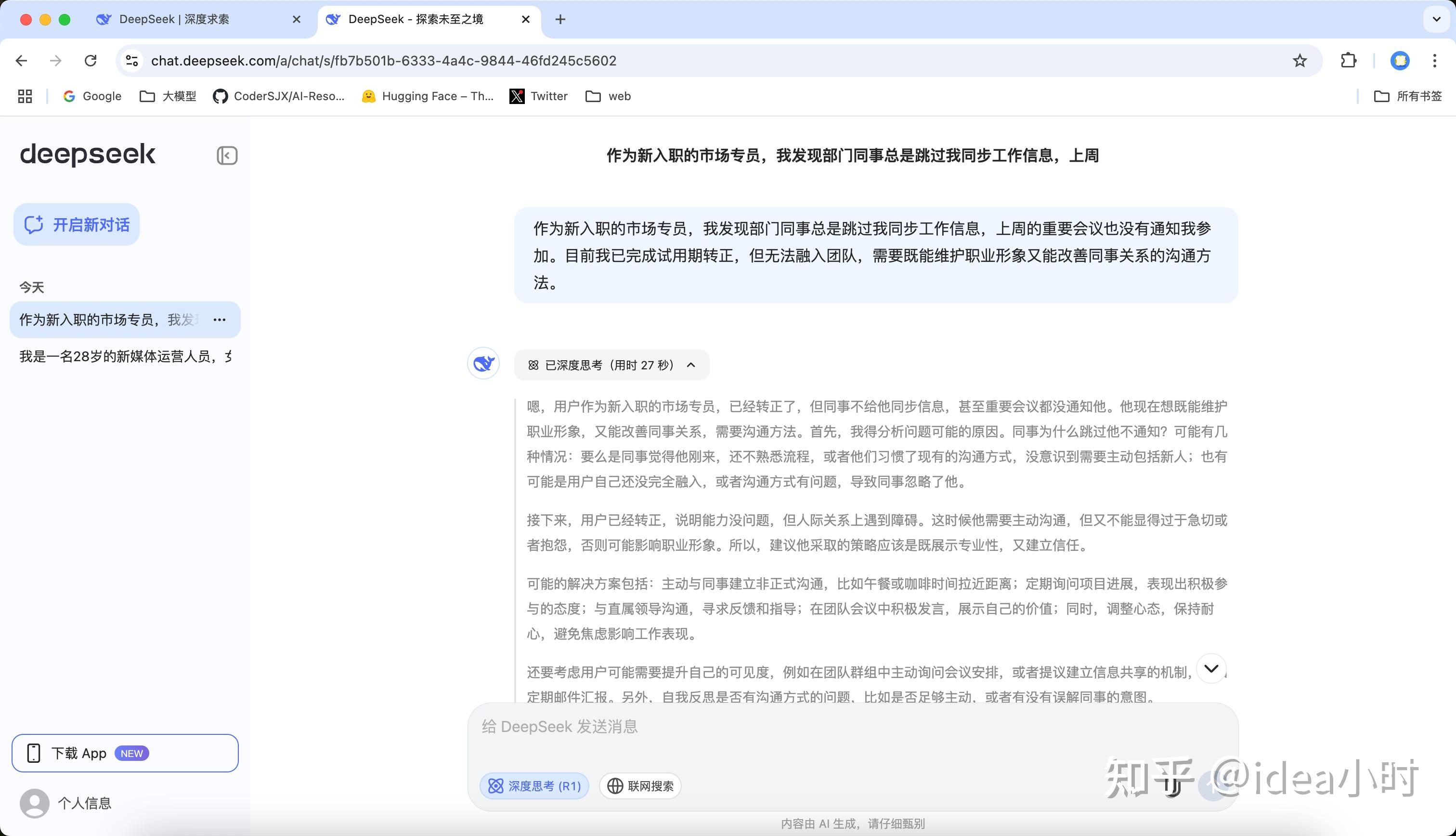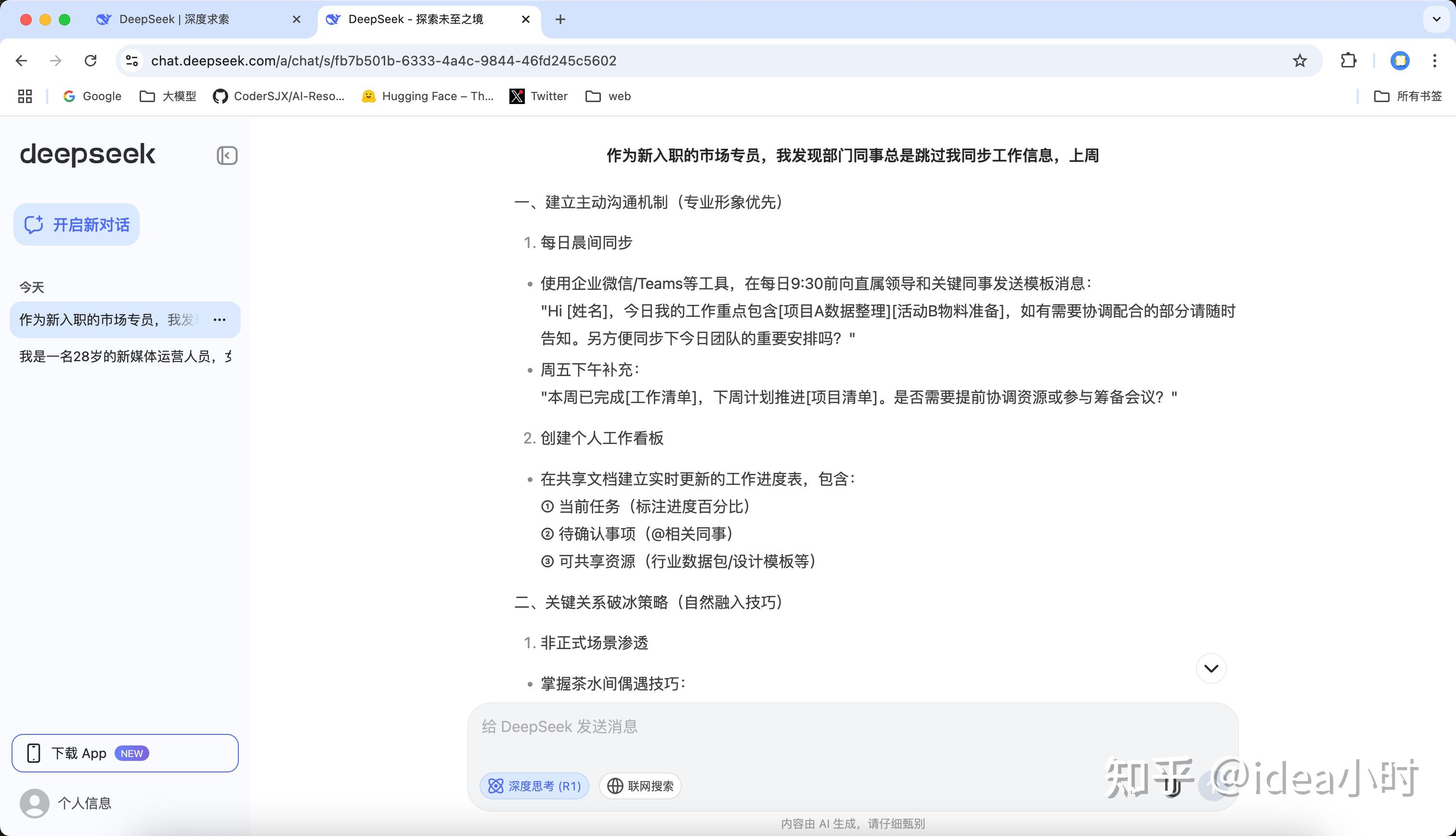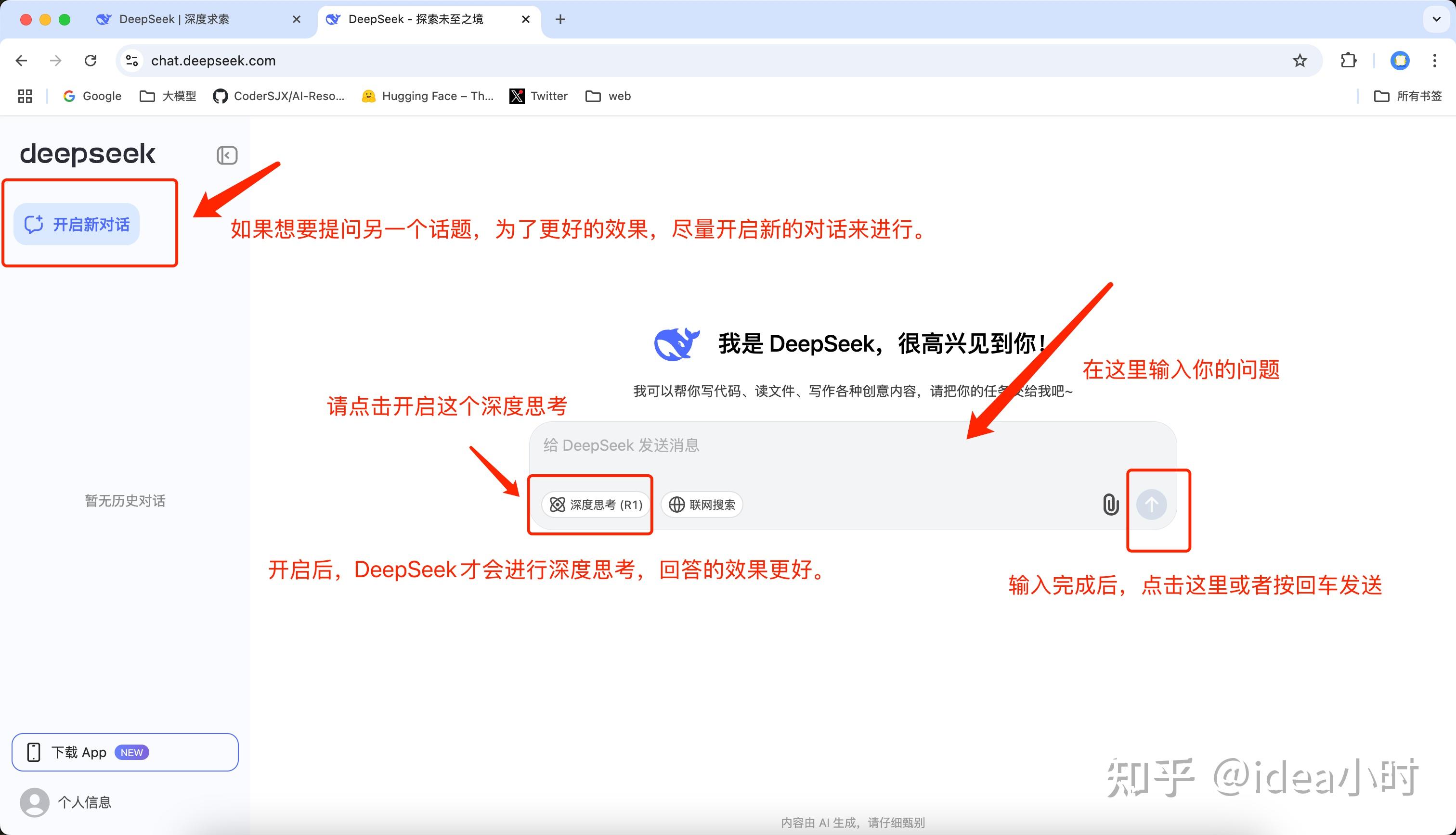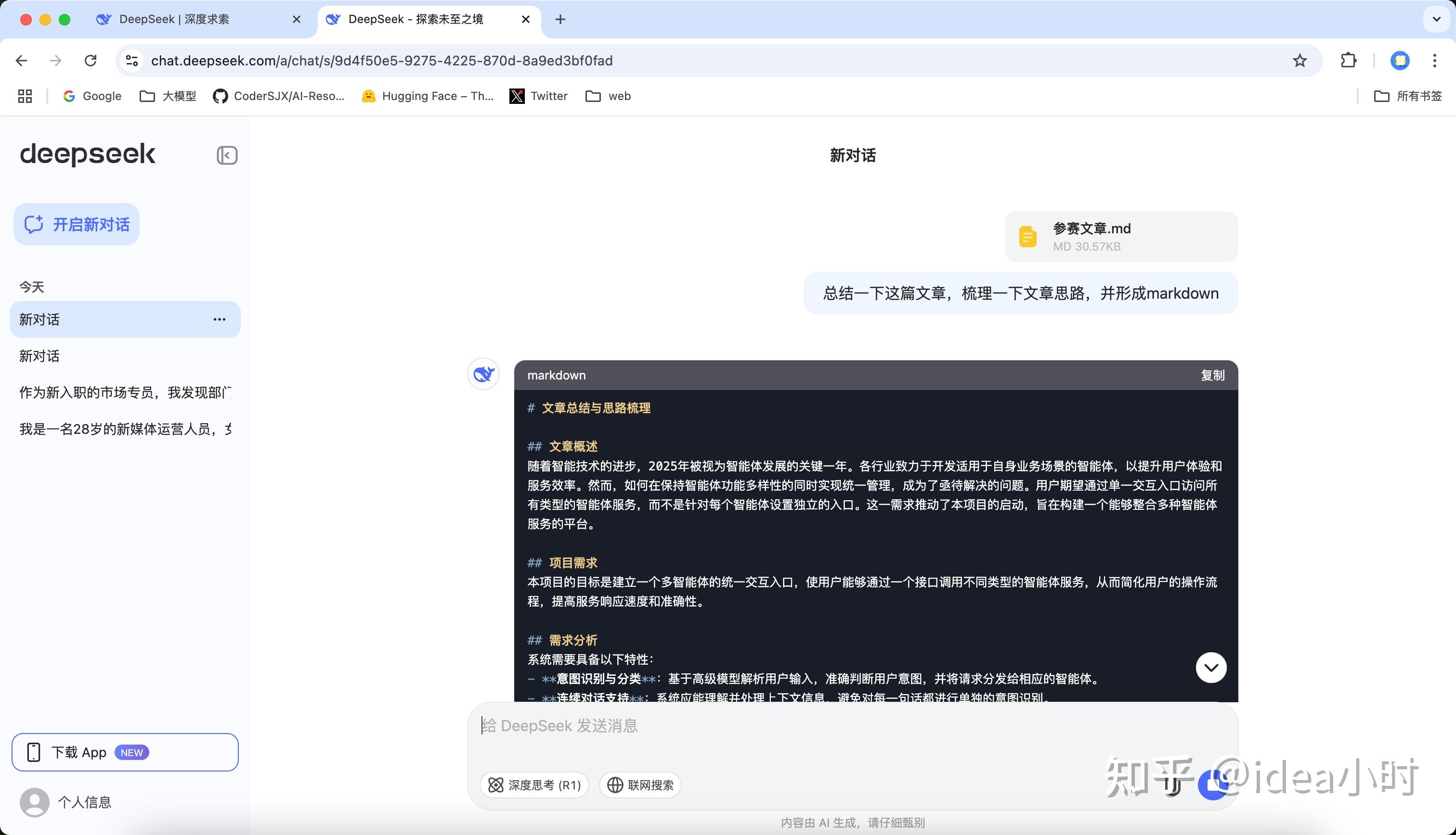 开启深度思考时,使用的是DeepSeek R1模型,这是推理模型,模型可以进行自我反思和纠错,并且具有思维链。