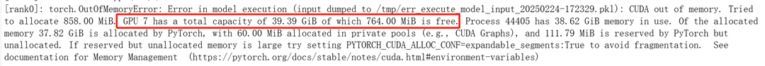 那么如何识别自己的OOM报错是出自训练还是推理呢?直接看报错的GPU卡号,因为默认是最后一张卡用于推理,如下图既然是GPU 7 内存不足,那就推理出了问题,只需要调整上述提到的两个参数即可。