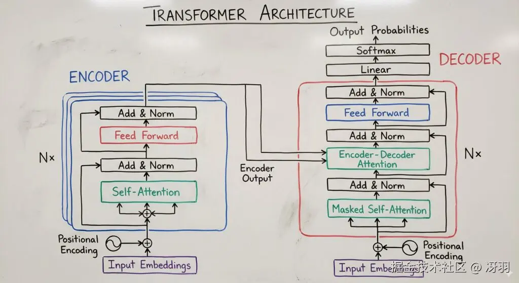 白板总结(教学用途):请用手绘白板图的形式总结“Transformer 神经网络架构”的概念,使其适用于大学讲座。编码器和解码器模块请使用不同颜色的马克笔,并清晰标注“自注意力”和“前馈”。