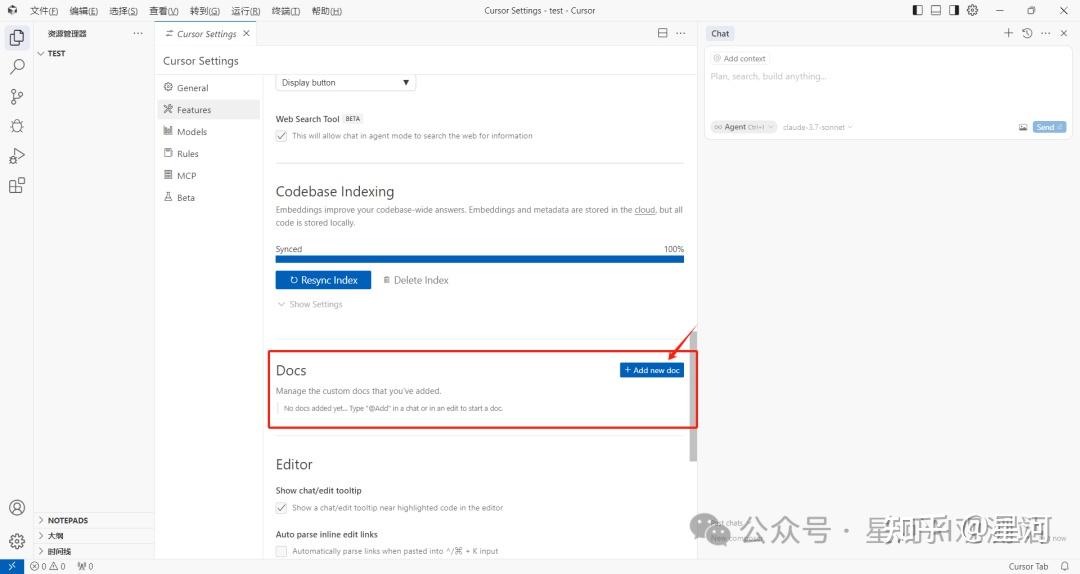 1)在Cursor配置页面,Features配置下,在Docs选项卡里点击“Add new doc”,添加新的文档配置: