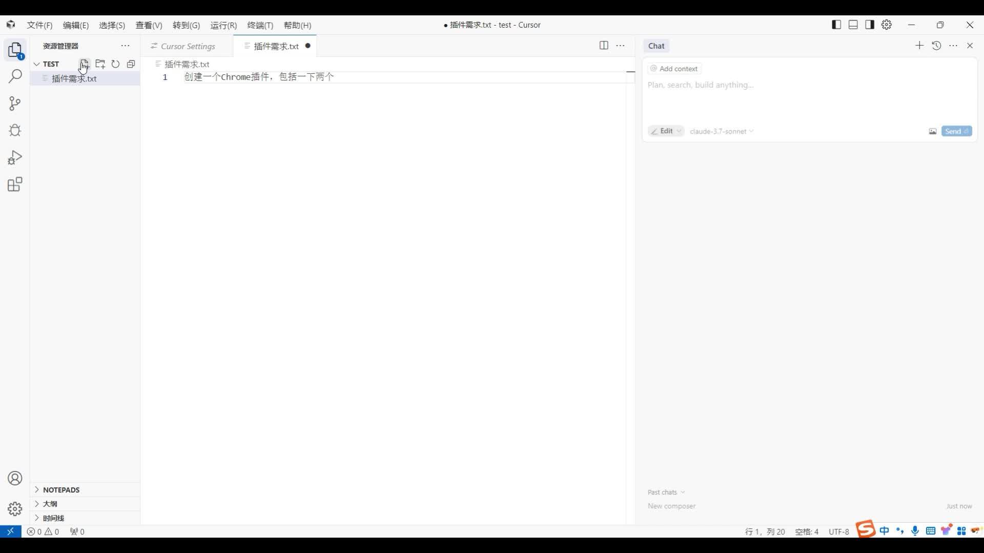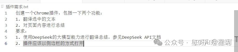 我们先来向Cursor说明一下我们的要求。创建一个“插件需求”文件,然后输入我们想要的功能说明。星河写的插件需求文件内容如下: