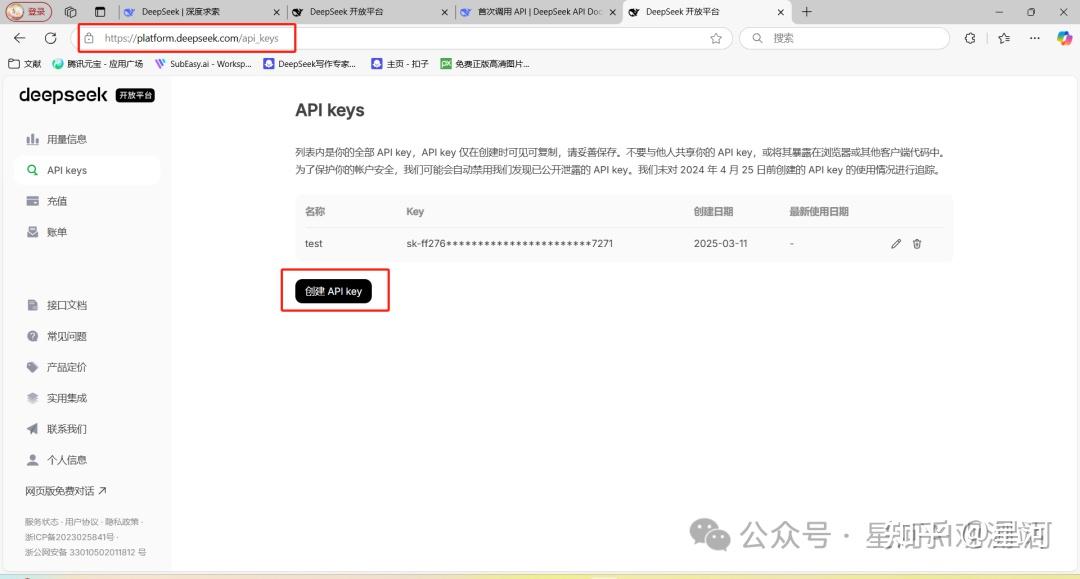 要在程序里调用DeepSeek的大模型功能,我们需要一个API Key。在DeepSeek上完成实名认证以后,登录https://platform.deepseek.com/api_keys页面,点击创建: