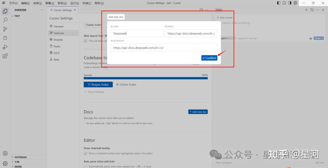 3)在Cursor里添加该网络地址,我们给这份文档取名“DeepSeek”,确认: