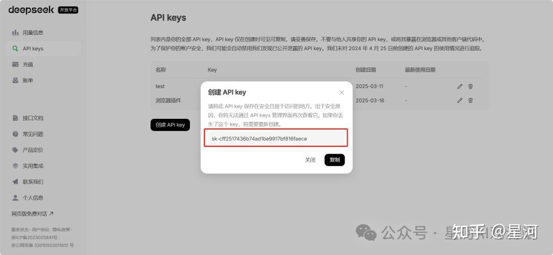 注意,一定要复制完API key之后再关闭这个页面,因为安全原因,这个Key之后就再也没法完整的显示了。另外使用DeepSeek的API功能是需要付费的,不过价格特别便宜,充个10块钱就够用很久了。