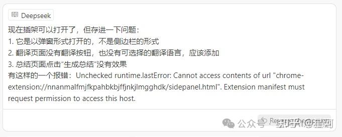 星河是一个C++程序员,对于Web端的开发可以说是一窍不通。在没有Cursor 等AI辅助编程的时代,如果星河想编写这样一个插件的话,从学习、实验到开发调试,保守估计需要一个星期左右的时间。而现在,星河在完全不懂Web端代码的情况下,只用了1个小时,就完成了翻译总结插件的开发和测试,这放在以前绝对无法想象!而且整个过程几乎没有用到任何和编程相关的技能,从头到尾就是“提出需求->交给Cursor开发->提出问题->交给Cursor解决->…”,然后开发就完成了!