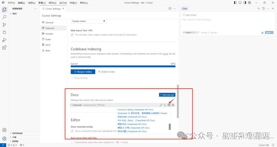 我们开发的翻译和总结插件,需要调用语言大模型来完成相关功能,这儿星河选择DeepSeek。为了让Cursor能够更好的使用DeepSeek的API,我们为Cursor配置DeepSeek的API文档,并在编程时进行引用。