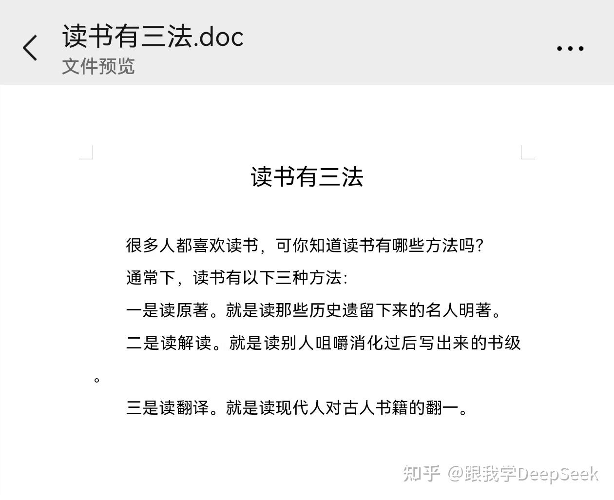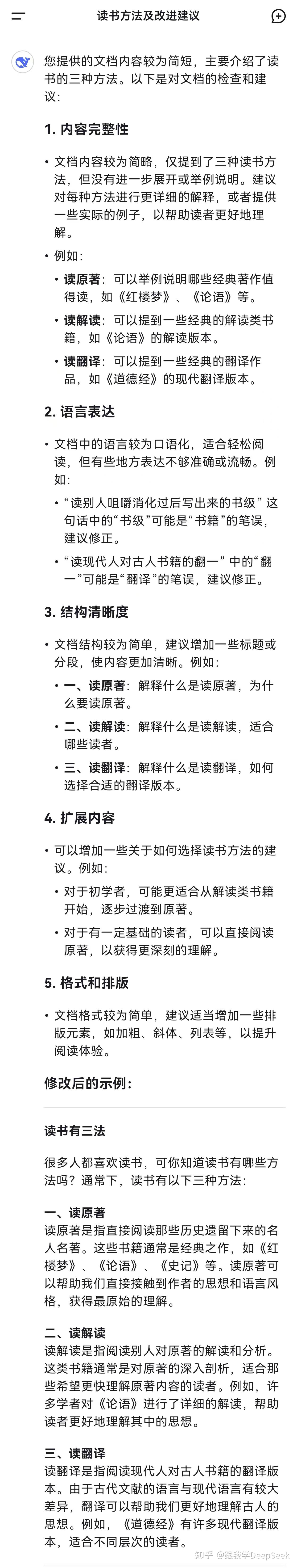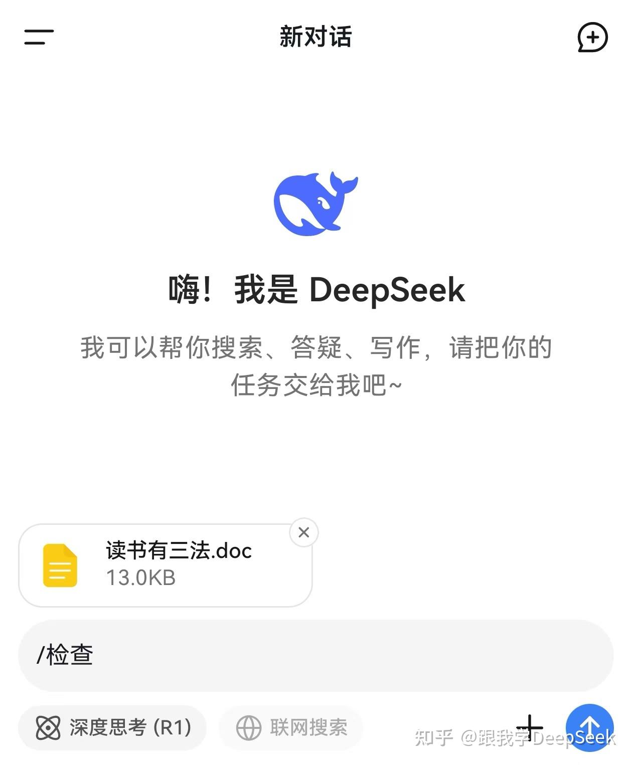 点击DeepSeek对话框右下角的回形针图标,上传一个测试文档“读书有三法”,然后在对话框中输入:/检查。