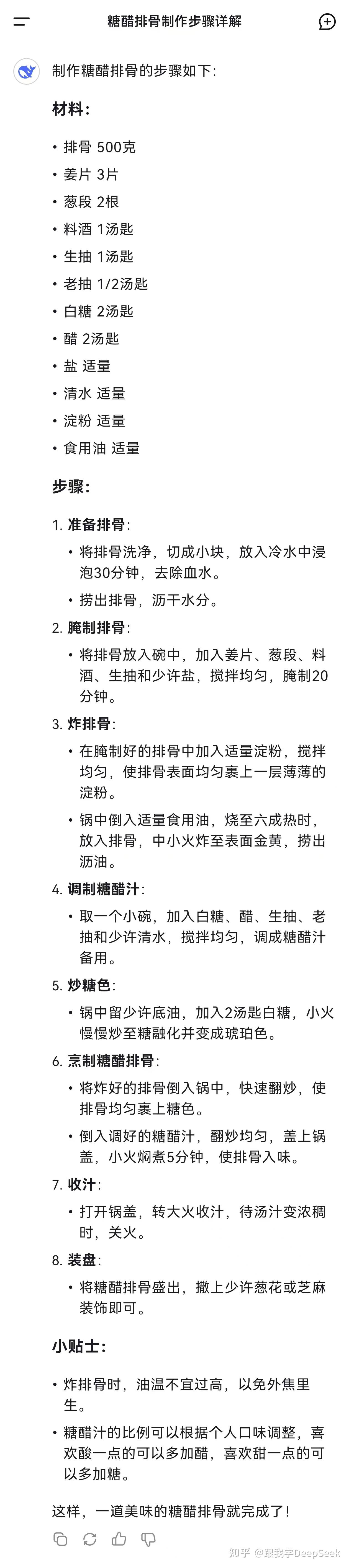 很快,DeepSeek就分步骤详细给出了糖醋排骨的制作过程,如下图所示。