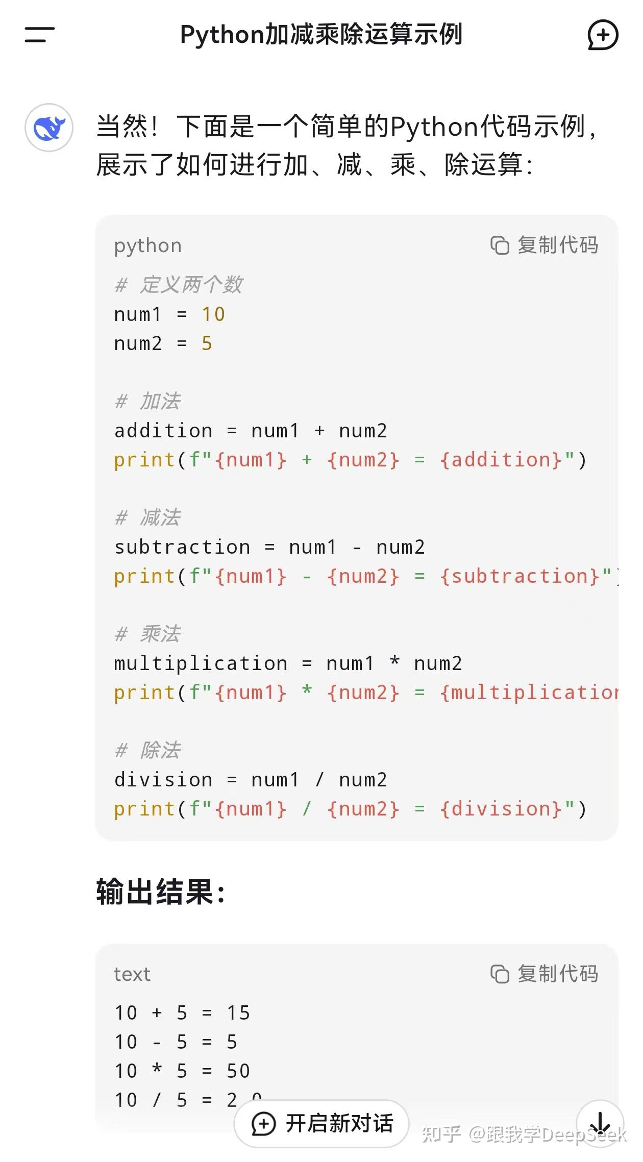 在DeepSeek对话框中输入:请用python写一段加减乘除代码,并/示例。