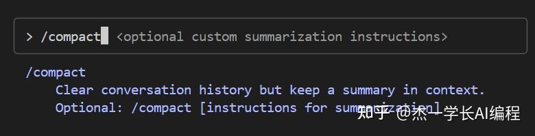 /compact,它的作用是压缩对话历史,只保留上下文摘要,从而减少 token 占用。
