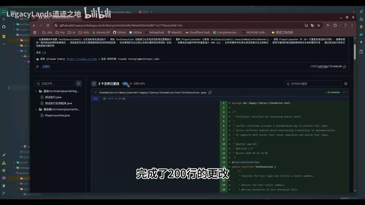 接下来,他准备更新Gradle Hub Issue,但我们建议暂缓此操作以便自行检查。可以看到他的代码编写非常详细且工整。这里包含一个接口定义、工具类实现以及测试代码。虽然测试代码因缺少依赖而报错,但这并非重点。编译已通过,总代码量为283行。