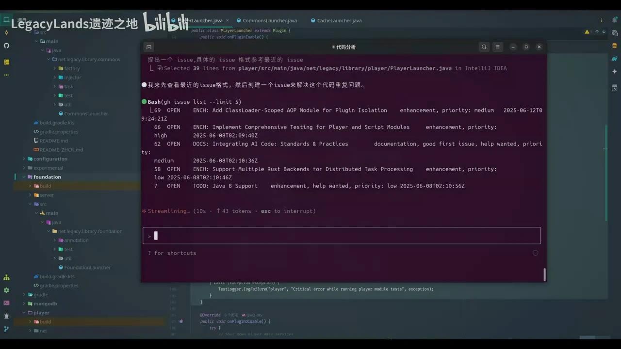 在检查过程中,发现存在代码重复问题。例如ParaLauncher模块中的RomDebugTest方法,与其他模块的测试代码高度重复。我们可以将这段代码复制到Claude Code中,它会自动标注代码来源。然后,我们要求它不要立即修改代码,而是先在GitHub上提交Issue。具体操作是使用已配置好的GitHub CLI工具,参照最近的Issue格式来提交问题报告。
