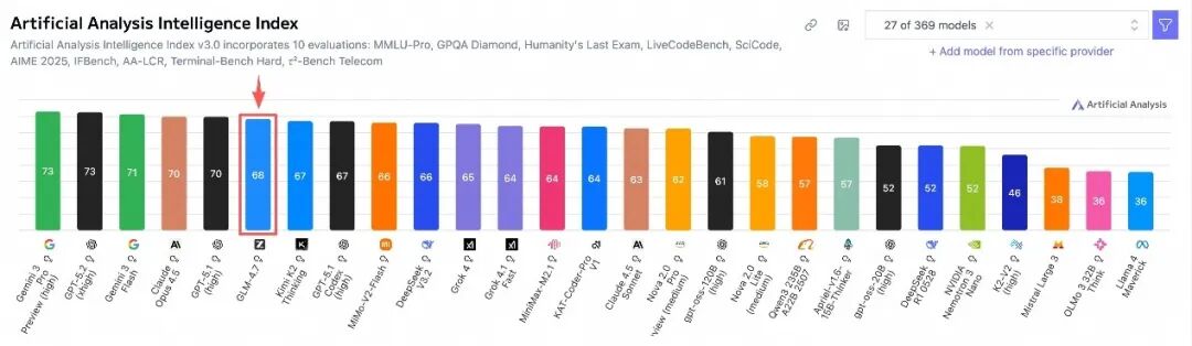 最新发布的GLM-4.7 不仅在Code Arena中位列开源第一、国产第一,并超越了GPT-5.2,还在全球知名的权威大模型评测榜单Artificial Analysis Intelligence Index(AA智能指数)中,以68分综合成绩荣登开源模型与国产模型双料榜首。