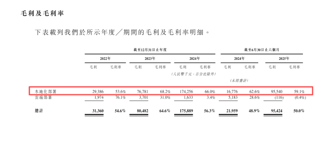 当然,智谱的商业化并非完全脱离传统ToB模式。本地化部署仍然是其重要收入来源,尤其在政务、金融、能源等对数据安全与实时性要求极高的行业。但值得注意的是,智谱本地化部署的互联网客户占到50%,且本地化部署毛利率一直保持在60%以上。与项目型软件不同,其交付产品是已经成熟的通用模型能力,这使得本地化部署在保持高毛利率的同时,并未削弱公司对模型主线的持续投入。