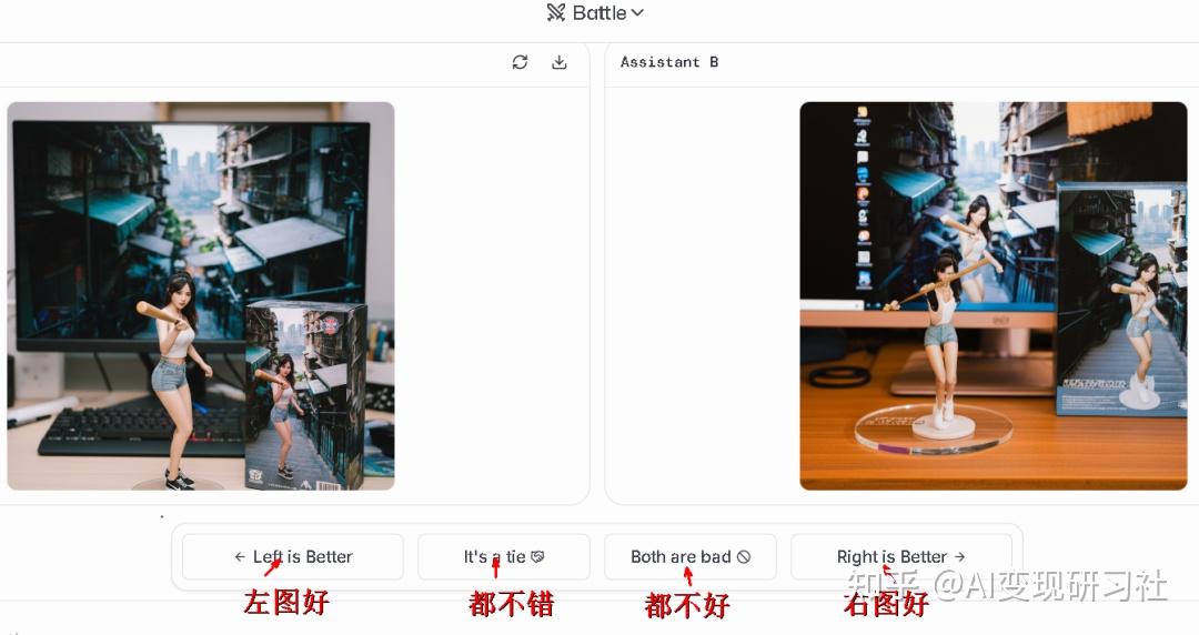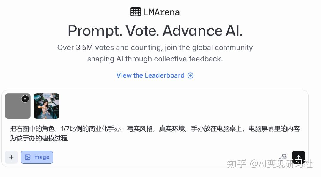 平台会让你给效果打分,按时点击即可。点击后,AI 的名字会显示在图片上。多用一会儿你会发现,效果好的基本都是 Nano Banana