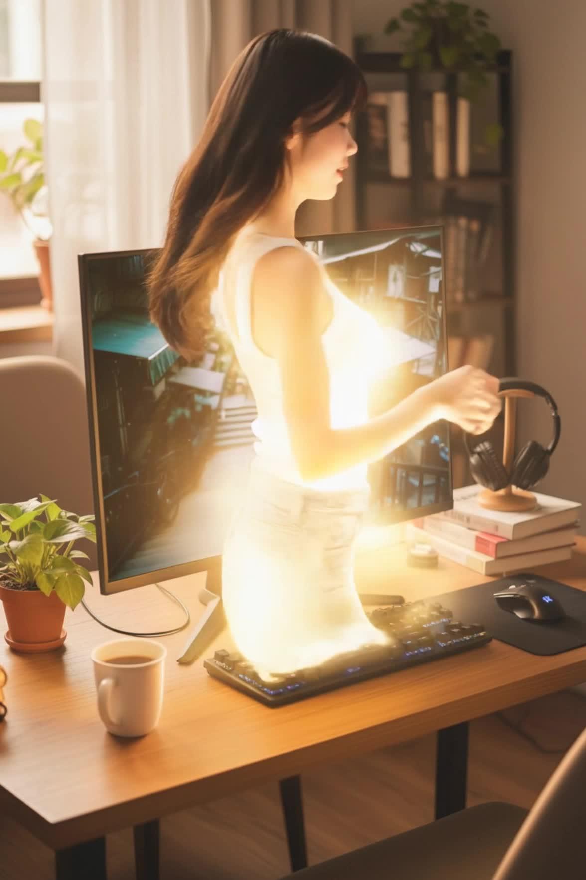 在闪耀的光芒中,美女从电脑中来到你的桌上,化身手办