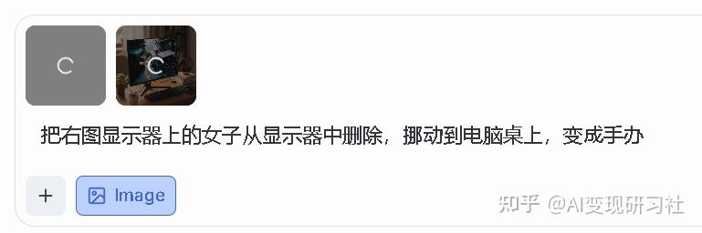输入提示词:“把左图中显示器上的女子从显示器中删除,挪动到电脑桌上,变成手办”