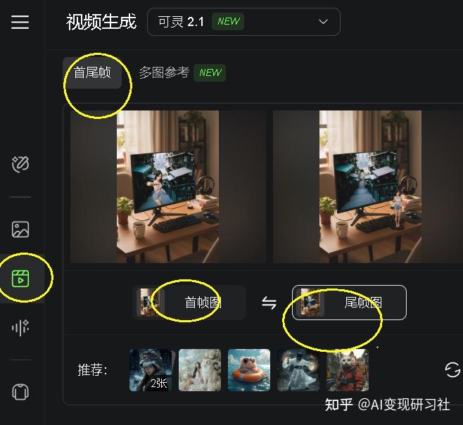 进入可灵,打开点左边导航栏的“生成”,在生成面板中选“视频生成“,“首尾帧“,上传刚才的两张图片