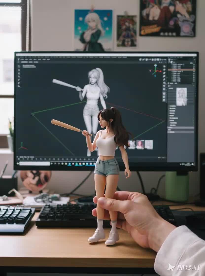 “拿着棒球帮的女人发耀眼的光芒,从显示器走出来,来到电脑桌上,变为手办”