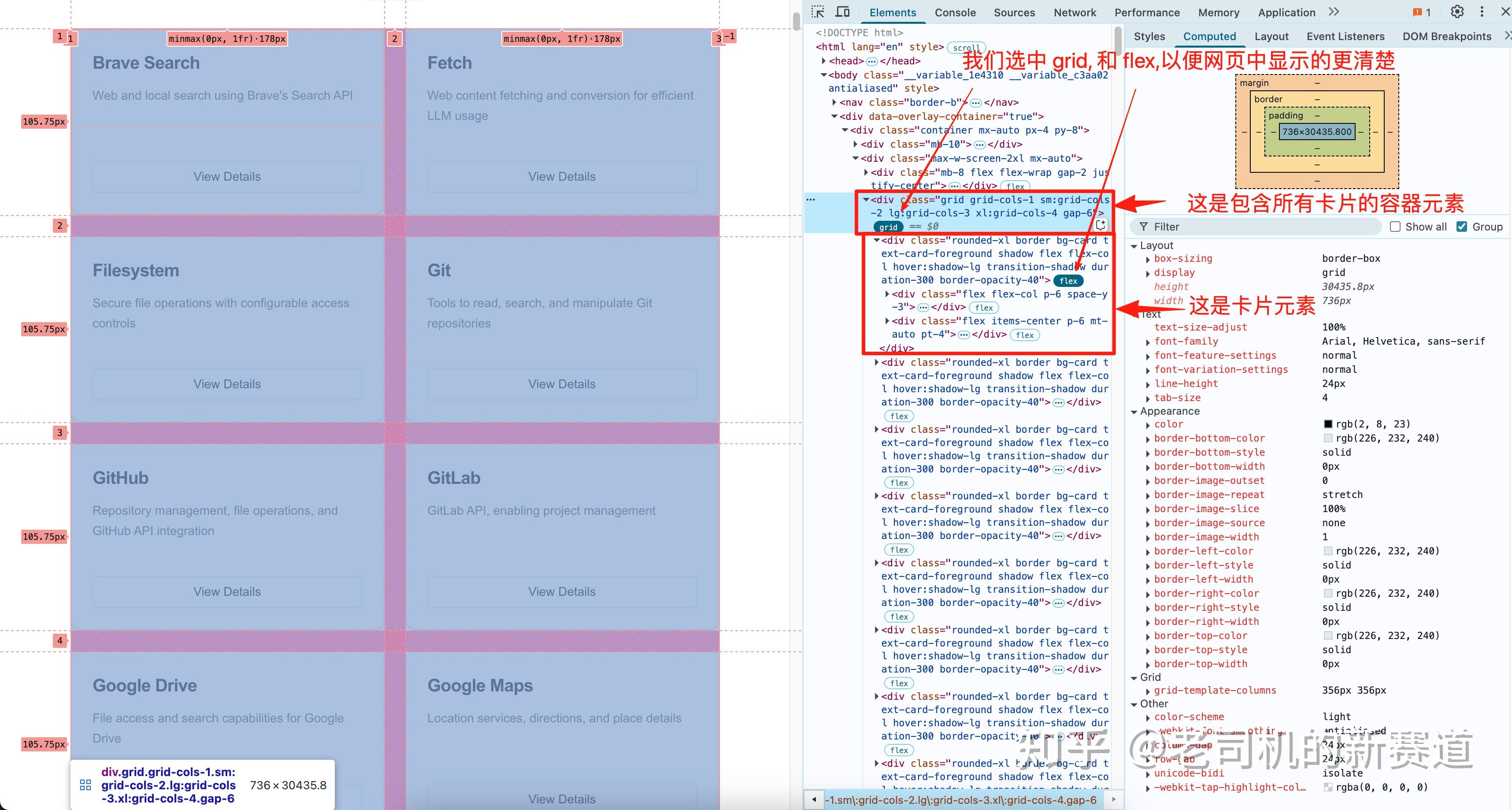 图中红色箭头指向的 grid 元素,就是装卡片的父级元素; 箭头指向的 flex 元素是单张卡片。